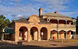 In December 1880, a second local newspaper, the Western Grazier, began publication in Wilcannia.[19] By early 1881 patients were being treated in the newly built local hospital.[20] At the census of 1881 the population of Wilcannia was recorded as 1,424 (976 males and 448 females).[16] Wilcannia was incorporated as a municipality in February 1883, with Edmond O'Donnell elected its first mayor.[21] The first major project of the municipality was the construction of water supply system for the township.[22] A July 1884 report stated that Wilcannia had a population "of about 1200", and was described as a township "of well-laid-out streets and good buildings", situated "in the centre of a large sheep country". The Post and Telegraph Office was reported to be "a handsome building" and several of the stores ("notably Frew, Wright, and Co., J. Palmer and Co., and Cramsie, Bowden, and Co.") were described as "not only extensive but of considerable architectural beauty". It was explained that a quarry of freestone "of excellent quality", within two miles (3 km) of the township "has been largely used for building purposes". The only local industry of note was a brewery.[23]