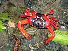 Rather than mammals, it is crabs that dominate the fauna.[10] There are at least 50 species on the island, some of them endemic, 30 of them terrestrial species whose only link with the ocean is the necessity to travel to the sea to breed. Several are small and inconspicuous, but others such as the coconut crab and Christmas Island red crab are large and present in enormous numbers. In the late twentieth century there were estimated to be about 120 million red crabs on the island, and the mass migration made by the mature individuals to the coast was spectacular.[10] The red crabs are a keystone species, feeding on the forest floor on leaves, fallen fruits, flowers, seedlings and carrion and maintaining a lawn-like turf. In the twenty-first century the number of red crabs has reduced considerably because of the accidental introduction of the yellow crazy ant to the island; this invasive species has formed supercolonies, killed crabs and had a profound impact on the biodiversity of the island.[10][11]
