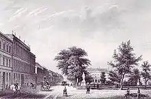 In 1826, Schinkel submitted his suggestion to move the position of the Leopold I Memorial as a part of the largest yet transfiguration of the square under his supervision. The other statues were also allocated new locations along the diagonals and lateral axes of the square. Besides these changes, he graced the surface of the square with greenery, a lawn dotted with lime trees and encircled by an oval walking path, which traced the borders of the square. Altogether, the new upgrades gave the space the appearance of a park.[19]
