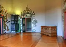 The palace is a four-winged structure with a nearly square floor plan. The comprehensive facilities include an outdoor parade grounds, a gatekeeper's house, pleasure gardens, a kitchen garden, a prison tower, stables, a bakery and a brewery. The spatial arrangement is typical for a residential palace. The halls were decorated with scrollwork and strapwork and adorned with decorative paintings, including a copy of the Iwein epos by Hartmann von Aue the basement.