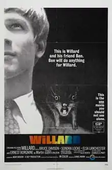 Willard is a 1971 American horror film directed by Daniel Mann and written by Gilbert Ralston, based on Stephen Gilbert's novel Ratman's Notebooks. Bruce Davison stars as social misfit Willard Stiles, who is squeezed out of the company started by his deceased father. His only friends are a couple of rats raised at home, including Ben and Socrates, and their increasing number of friends. When Socrates is killed by Willard's boss, he goes on a rampage using his rats to attack.