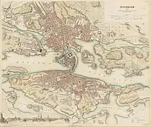 Clarke's Plan of Ancient Rome, with architectural views, was engraved by J. and C. Walker and published under the superintendence of the Society in 1830, and had a companion Plan of Modern Rome. Under the same auspices his plan of Warsaw (engraved by T. E. Nicholson) is dated 1831, his Milan and Frankfurt am Main 1832, his Berlin, and his Turin, with three views, 1833 (both engraved by J. Henshall); his Paris and St Petersburg are of 1834. His London, Florence, Genoa, Venice and Amsterdam (engraved by Benjamin Rees Davies, 1789–1872) are dated 1835, his Moscow 1836, and his Naples, with architectural view (engraved by T. Bradley) is of 1838.[44] His Scandinavian efforts include Copenhagen, with a panorama (J. Henshall), dated 1837, and Stockholm (1838). Clarke's plans and maps, of which he produced many, are still admired and collected.