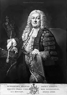 Browne was born in County Durham, and was educated at Durham School and at Peterhouse, Cambridge.[1] After graduating (1711 BA, 1714 MA, & 1716 license), he worked as a doctor in King's Lynn, Norfolk, for more than thirty years before moving to Bloomsbury, London, in 1749. He was President of the College of Physicians in 1765 and 1766, having been a Fellow of the college since 1726; he resigned during his five-year term of office because of a dispute. He became a Fellow of the Royal Society in 1739, and was knighted in 1748. He died on 10 March 1774, and left money for a scholarship at Peterhouse and gold medals to be awarded for poetry in Greek and Latin to Cambridge students (the Sir Willam Browne's Medals).[2][3]