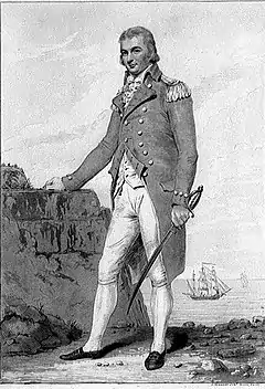 Carnegie entered the Royal Navy in 1771 on board the third-rate HMS Albion. Subsequently he served on the frigate HMS Southampton in home waters, where he assisted in transporting the Queen of Denmark across the English Channel, and in the post ship HMS Squirrel, in which he sailed for Jamaica in 1774 while still a midshipman.[2][3][4][1] In early 1777 he was made an acting lieutenant in HMS Nonsuch before being confirmed as a lieutenant on 7 December in HMS Apollo on the North American Station.[2][5][6] Carnegie served on Apollo for just under two years before joining the flagship of Rear-Admiral Sir John Lockhart-Ross, the ship of the line HMS Royal George.[2] In Royal George he joined the fleet of Admiral Sir George Rodney sent to relieve the siege of Gibraltar. On their way towards Gibraltar the fleet fought the action of 8 January 1780, where they captured a large Spanish convoy. Carnegie subsequently participated in the Battle of Cape St. Vincent on 16 January which cleared the way for the British fleet, allowing them to successfully reach Gibraltar on 25 January.[1]
