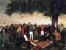 After the disbandment of the regular Texas army in 1841, Colonel Cooke was offered to run for vice president of the Republic, but he declined and was appointed senior civilian member of the Texan Santa Fe Expedition the same year.[7][8] The aim of the expedition was to persuade those of the people of New Mexico who lived within the Texas' claims, to accept allegiance to the Republic. Almost lost and starving, the expedition made contact with the Mexican authorities when a vanguard was surrounded and taken prisoners on September 15, 1841. Two days later the main expedition was surrounded by superior forces, and Colonel Cooke surrendered. The members of the expedition were made Mexican prisoners, marched to Mexico City, and kept incarcerated.[12] The captivity lasted until the summer of 1842, when everyone except José Antonio Navarro was set free. Colonel Cook stayed in Mexico City recovering in the residence of the American minister Waddy Thompson Jr., before he and the American born members of the expedition were sent home courtesy of the United States Government.[13]