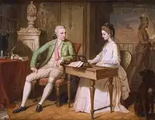 The Hamiltons gave musical entertainments in which they played (William the violin, and Catherine the harpsichord or pianoforte) with some of their servants or professional musicians.[24] During their tour of Italy in 1770, the young Mozart and his father were introduced to the Hamiltons. Catherine played the harpsichord for Mozart, and he said he found her performance "uncommonly moving".[25] Another musical visitor was the music historian Charles Burney, who stayed at Villa Angelica at Portici and was helped by Hamilton with his research. Burney thought that Catherine Hamilton was the best harpsichord player in Naples.[26] When the young Irish singer Michael Kelly arrived in Naples, he was introduced to the Court by Hamilton.[27] The young Irish composer Thomas Carter also stayed with him around 1788.[28]