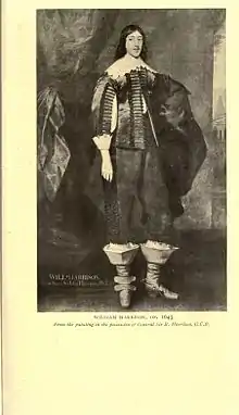 Harrison was quite prominent in the first session of the Long Parliament, as noted by Simonds D'Ewes. His father, an important financier, agreed to give up £50,000 to the parliament, and Harrison was nominated to receive it.[4] When Charles I of England went to Nottingham in August 1642, to raise the Royal Standard—the event that marked the outbreak of the First English Civil War—Harrison accompanied him.[2] Parliament retaliated against his father.[5]