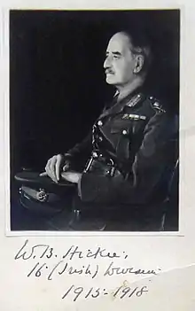 Promoted major general, Hickie took over from Lieutenant General Sir Lawrence Parsons. Hickie – one of a rare breed, a senior, Irish, Catholic officer – was a popular replacement. It was politically a highly sensitive appointment which required the professionalism and political awareness Hickie fortunately possessed as the division was formed around a core of Irish National Volunteers in response to Carson's Ulster Volunteers. He was much more diplomatic and tactful than his predecessors and spoke of the pride which his new command gave him,[10] but did not hesitate to make sweeping changes amongst the senior officers of the Irish Division. After putting the division through intensive training, it left under Irish command of which each man took personal pride. It arrived in December 1915.[11]