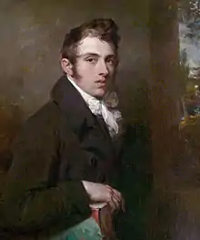 In 1800, Hilton was apprenticed to the engraver John Raphael Smith, and around the same time enrolled at the Royal Academy Schools.[4] Another apprentice from 1802 was Peter De Wint; they were inseparable friends and lived together in Broad Street, Golden Square. De Wint married William's only sister Harriett. De Wint visited Hilton's home in Up-Hill, Lincoln and painted many of his charming landscapes in the district. In Lincoln cathedral is a cenotaph erected by Mrs De Wint in memory of the two artists – De Wint her husband, and Hilton, her brother.[5] Hilton first exhibited at the Royal Academy in 1803, sending a Group of Banditti, and soon established a reputation for choice of subject and qualities of design and colour superior to the great mass of his contemporaries. He made a tour in Italy with Thomas Phillips, the portraitist.[4]
