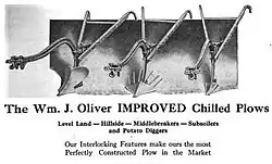 In 1916, the International Association of Machinists attempted to unionize Oliver's factory in Knoxville, leading to a lockout.[27] In July of that year, labor activist Joseph Gilmour organized a rally at the factory. According to a report issued by Gilmour, he was met at the rally by Oliver and about fifty "strike-breaking thugs and officials." Gilmour stated that as he tried to speak, Oliver's men blasted him with a fire hose, and afterward attacked him and knocked him unconscious.[28]