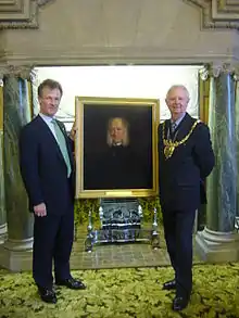 A full-length portrait by Hugh Ford Crighton was presented to the council by the members of the Sheffield Squadron of the Yeomanry, on 13 February 1867. Having been damaged by a fall from the wall of the Council Chamber, it was repainted by the artist in 1877 at a cost of £63. This new portrait was lent by the Corporation to the Weston Park Museum from July 1877, to October 1879. This full-size portrait is now in the possession of William's descendants.[14] A smaller ¾ length portrait, again by H.F. Crighton hung originally in the Committee Room at the Town Clerk's Offices, Hartshead.[14] The original belongs to William Jeffcock. He donated a copy of this ¾ length portrait to The Lord Mayors Office and it now hangs in the Lord Mayor's Parlour of Sheffield Town Hall.[15]