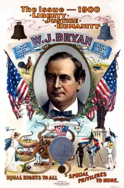 With the implosion of Dewey's candidacy, 1896 Democratic presidential nominee and former Congressman William Jennings Bryan became the front-runner for the 1900 Democratic presidential nomination.[2] Even though various prominent Democrats tried to convince Bryan to drop his support of free silver (due to the fact that, unlike in the 1896 election, the economy was recovering and in good shape at this point in time), Bryan refused and threatened to run as an independent if the Democrats didn't adopt a pro-free silver plank.[2][3] Ultimately, Bryan won out and free silver was put into the 1900 Democratic platform by a one-vote margin--with Bryan becoming the 1900 Democratic presidential nominee.[2] In addition, the Democrats criticized the Republicans for their imperialism, for the Philippine–American War, and for the proliferation of trusts.[2][3]