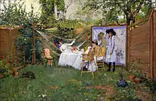 Chase also frequently painted his wife Alice and their children, sometimes in individual portraits, and other times in scenes of domestic tranquility: at breakfast in their backyard, or relaxing at their summer home on Long Island, the children playing on the floor or among the sand dunes of Shinnecock. In an 1895 painting titled A Friendly Call, his wife is depicted wearing a yellow dress and entertaining a caller dressed in white.[10]