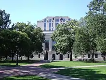 His extensive service at Ohio State University (26 years) is honored with a larger-than-life bronze statue by Erwin Frey[4] of President Thompson in academic dress, positioned in front of the eponymous William Oxley Thompson Memorial Library on "The Oval" (the central green space on the Ohio State University campus). He is known for being involved in students education and social lives, presiding over the Ohio State win over Oxford University on October 10, 1924 in intercollegiate debate. Thompson's tenure at Ohio State was marked by two seminal events. The first occurred in 1906 with the passage by the Ohio Legislature of the Eagleson Bill, which formalized and legally locked in Ohio State's flagship role in the state's public system of higher education. The Eagleson law mandated that only Ohio State, among Ohio's public universities, would be allowed to offer doctoral education or conduct basic research. The second event, and the culmination of both the raison d'être for Ohio State's founding in 1870 and the aim of the Eagleson Bill in 1906, occurred in 1916 with Ohio State's election into the Association of American Universities. Thompson also served as President of the University during World War One, which saw a massive drop in student attendance for 1917-1918 as many left to join the military or other war-related activities.