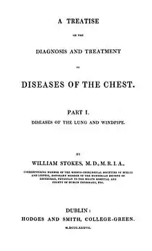 William Stokes (1 October 1804 – 10 January 1878) was an Irish physician, who was Regius Professor of Physic at the University of Dublin. He graduated from the University of Edinburgh Medical School with an MD in 1825 later returning the practice in Dublin at Meath Hospital. He went on to create two important works on cardiac and pulmonary diseases – A Treatise on the Diagnosis and Treatment of Diseases of the Chest (1837) and The Diseases of the Heart and Aorta (1854) – as well as one of the first treatises on the use of the stethoscope. He emphasised the importance of clinical examination in forming diagnoses, and of ward-based learning for students of medicine.