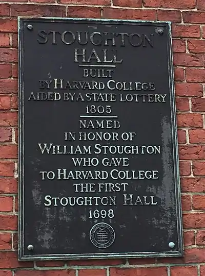 The town of Stoughton, Massachusetts is named in his honor,[2] as is one of the Harvard College dormitories in Harvard Yard. Construction of the first Stoughton Hall, in 1698, was made possible by his £1,000 gift.[52]