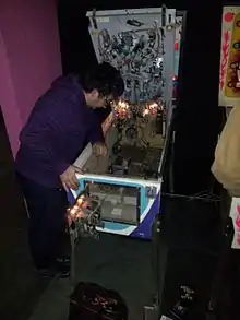 Stanford engineering graduate Harry Williams entered the coin-operated amusement industry in 1933 and helped popularize several important pinball innovations such as the tilt mechanism, electrically-powered scoring holes, and the ability to win a free play by achieving a certain score. After working for a succession of companies including Pacific Amusement Manufacturing, Rock-Ola, and Exhibit Supply, he went into business with Lyndon Durant in 1942 under the name United Manufacturing. After a break with Durant, Williams founded the Williams Manufacturing Company in 1943 at 161 West Huron Street in Chicago, Illinois.[5] The first seven products were a fortune-telling machine called Selector Scope (1944), two electro-mechanical (EM) games, Periscope (1944) and Liberator (1944), a novelty called Zingo (1944), a pinball conversion called Flat-Top (1945), another EM arcade game, Circus Romance (1945) and a second pinball conversion called Laura (1945). The two pinball conversions (Flat-Top & Laura) were built by purchasing older pinball machines made by other companies and changing artwork and other elements on the playfield. The lack of raw materials during World War II made the manufacture of new machines difficult and expensive.[6] The first all original amusement device made by Williams was a flipperless pinball machine called Suspense (1946). During the late 1940s and early 1950s, Williams continued to make pinball machines and the occasional bat-and-ball game. In 1950, Williams produced Lucky Inning, their first pinball machine to have its bottom flippers facing inward in the modern manner.[6]