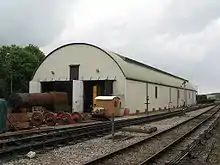 The station is a major site for the WSR's workshops. The former goods shed was converted for use by the DEPG as a locomotive workshop; this has since been supplemented by a purpose-built workshop nearby. At the far end of the station yard is a pre-fabricated building that is used for steam locomotive and coach overhauls by the West Somerset Railway Association, the volunteer supporters of the West Somerset Railway; it was originally erected at Swindon Works in 1899 and is Grade II listed[2] and was donated by Tarmac Ltd following the closure of the works.