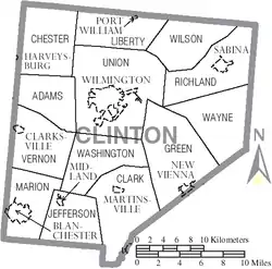 Clinton County is a county located in the U.S. state of Ohio. As of the 2020 census, the population was 42,018.[2] The county seat is Wilmington.[3] The county is named for former U.S. Vice President George Clinton.[4] Clinton County comprises the Wilmington, Ohio Micropolitan Statistical Area, which is also included in the Cincinnati-Wilmington-Maysville, OH-KY-IN Combined Statistical Area.