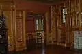 Before the 1906 earthquake, the house had been seven stories high and carpenters may have been brought in initially to repair damage caused by the quake.[10] Today it is only four stories. The house is predominantly made of redwood, as Mrs. Winchester preferred the wood; however, she disliked the look of it. She, therefore, demanded that a faux grain and stain be applied. This is why almost all the wood in the home is covered. Approximately 20,500 U.S. gallons (78,000 L) of paint were required to paint the house. The home itself is built using a floating foundation that is believed to have saved it from total collapse in the 1906 earthquake and the 1989 Loma Prieta earthquake. This type of construction allows the home to shift freely, as it is not completely attached to its brick base. There are roughly 161 rooms, including 40 bedrooms, two ballrooms (one completed and one unfinished) as well as 47 fireplaces, over 10,000 panes of glass, 17 chimneys (with evidence of two others), two basement levels and three elevators. Winchester's property was about 162 acres (66 ha) at one time, but the estate has since been reduced to 4.5 acres (1.8 ha) – the minimum necessary to contain the house and nearby outbuildings. It has gold and silver chandeliers, hand-inlaid parquet floors and trim, and a vast array of colors and materials. Due to Mrs. Winchester's debilitating arthritis, special "easy riser" stairways were installed as a replacement for her original steep construction. This allowed her to move about her home freely as she was only able to raise each foot a few inches. There was only one working toilet for Winchester; it has been said that "all other restrooms were decoys to confuse spirits" and that this is also "the reason why she slept in a different room each night".[12] The home's conveniences were rare at the time of its construction. These included steam and forced-air heating, modern indoor toilets and plumbing, push-button gas lights, and Mrs. Winchester's personal (and only) hot shower from indoor plumbing. There are also three elevators, including an Otis electric and one of which was powered by a rare horizontal hydraulic elevator piston. Most elevator pistons are vertical to save space, but Winchester preferred the improved functionality of the horizontal configuration.