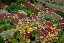In 1884, she purchased an unfinished farmhouse in the Santa Clara Valley and began building her mansion. Carpenters were hired and worked on the house day and night until it rose to seven stories. Eschewing architects, she directed the additions herself, augmenting the building in a haphazard fashion. As a result, contains numerous oddities such as doors and stairs that go nowhere, windows overlooking other rooms, and stairs with oddly-sized risers.[9] Environmental psychologists have theorized that the house's odd layout itself contributes to the feeling that it was (and perhaps still is) haunted.[10][11]