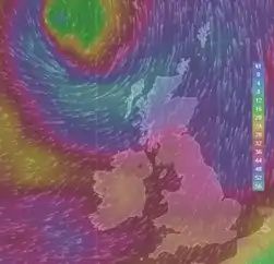 It is generally reported in METAR when the peak wind speed reaches at least 16 knots and the variation in wind speed between the peaks and average wind is at least 9 to 10 knots.[1][4] In marine meteorology, the top speed of a burst is expressed in meters per second (m/s) or in knots, while the Beaufort scale is used for reporting the mean speed. When the maximum speed exceeds the average speed by 10 to 15 knots, the term gusts is used while strong gusts is used for departure of 15 to 25 knots, and violent gusts when it exceeds 25 knots.[4]