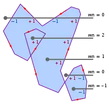 A point's winding number with respect to a polygon can be used to solve the point in polygon (PIP) problem – that is, it can be used to determine if the point is inside the polygon or not.