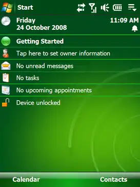 The user interface changed dramatically between versions, only retaining similar functionality. The Today Screen, later called the Home Screen, shows the current date, owner information, upcoming appointments, e-mails, and tasks. The taskbar displays the current time as well as the volume level. Devices with a cellular radio also show the signal strength on said taskbar.