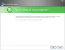 When started for the first time, WSR presents a microphone setup wizard and an optional interactive step-by-step tutorial that users can commence to learn basic commands while adapting the recognizer to their specific voice characteristics;[36] the tutorial is estimated to require approximately 10 minutes to complete.[39] The accuracy of the recognizer increases through regular use, which adapts it to contexts, grammars, patterns, and vocabularies.[38][40] Custom language models for the specific contexts, phonetics, and terminologies of users in particular occupational fields such as legal or medical are also supported.[41] With Windows Search,[42] the recognizer also can optionally harvest text in documents, email, as well as handwritten tablet PC input to contextualize and disambiguate terms to improve accuracy; no information is sent to Microsoft.[40]