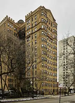 The Windsor Beach Apartments, historically known as the South Shore Beach Apartments, is a historic apartment building in the South Shore neighborhood of Chicago, Illinois. The building was constructed in 1927–28, shortly before the Great Depression ended the initial wave of apartment construction in Chicago. Its lakefront location and the relative seclusion of its apartments, with no more than eight per floor, catered to well-off residents. Architect Robert S. De Goyler designed the building; his design blends Moorish elements with the newly popular Art Deco and Moderne styles. The thirteen-story building features patterned brickwork, an arched entrance path, and projecting window bays on its front.[2][3]