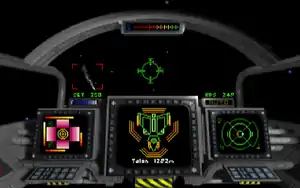 When flying, the main view is a first-person look from inside the cockpit at the cockpit screens (HUDs) and the space before the ship. Space combat simulation is similar to the style of other Wing Commander games of its time. On planets and bases, a static overview/first-person-view is used to show the rooms and interact with people. Menus are used for buying, selling, or taking missions from the mission computer.