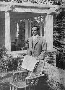 In 1898, Churchill commissioned Charles Platt to design a mansion in Cornish, New Hampshire. Churchill moved there the following year and named it Harlakenden House. From 1913 to 1915, he leased it to Woodrow Wilson, who used it as a summer house. Churchill became involved in the Cornish Art Colony and went into politics, winning election to the state legislature in 1903 and 1905.[3] In 1906, he unsuccessfully sought the Republican nomination for governor of New Hampshire. In 1912, he was nominated as the Progressive candidate for governor but did not win the election and did not seek public office again. In 1917, he toured the battlefields of World War I and wrote his first non-fiction work about what he saw.