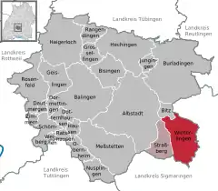 Winterlingen is a municipality (Gemeinde) of the Zollernalb district of Baden-Württemberg, one of the 16 States of the Federal Republic of Germany. It lies along the south-eastern edge of the district and borders the district of Sigmaringen to the east. Winterlingen is physically located in the Middle Flächenalb, between the valleys of the Schmiech and Lauchert rivers. A small portion of the municipal area is located in the Baar region to the west. Elevation above sea level in the municipal area ranges from a high of 902 meters (2,959 ft) Normalnull (NN) to a low of 632 meters (2,073 ft) NN.[3]