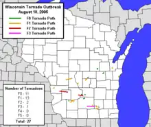 The Wisconsin tornado outbreak of 2005 was an outbreak of tornadoes that occurred primarily in southern Wisconsin on August 18, 2005. A system of storms unleashed a total of 28 tornadoes, 27 of which were confirmed in southern Wisconsin, and 1 confirmed in Minnesota. This outbreak set a new record for the most tornadoes observed in the state in a single day, breaking the previous record of 24 tornadoes set on May 8, 1988.[1] The system generating the Stoughton tornado was also accompanied by many reports of severe winds and hail throughout the region. The Stoughton tornado was documented on an episode of The Weather Channel's Storm Stories.[2]