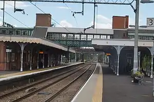 Witham railway station is on the Great Eastern Main Line (GEML) in the East of England, serving the town of Witham, Essex. It is about half a mile (1 km) to the north of the town centre and is 38 miles 48 chains (62.1 km) down the line from London Liverpool Street. On the GEML Witham is situated between Hatfield Peverel to the west and Kelvedon to the east.[1] It is the junction for the Braintree Branch Line to the east which opened in 1848, and between 1848 and 1964 it was also the junction for a west-facing branch line to Maldon. Its three-letter station code is WTM.
