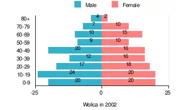 According to the 2002 Poland census, there were 250 people residing in Wolica village, of whom 49.2% were male and 50.8% were female. In the village, the population was spread out, with 32.4% under the age of 18, 32.8% from 18 to 44, 17.6% from 45 to 64, and 17.2% who were 65 years of age or older.[1]