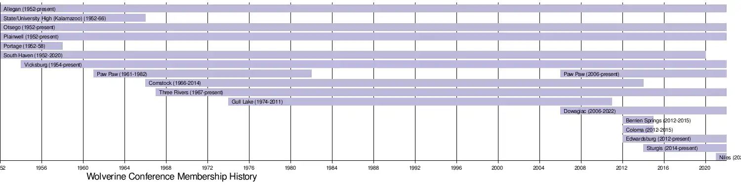 The Wolverine Conference was formed in 1952, consisting of Allegan, Western State High (Kalamazoo), Otsego, Plainwell, Portage, and South Haven.[5] Five boys sports were sponsored by the league that first year: football, basketball, baseball, tennis and track. Girls sports were added in the 1973-74 year with basketball, tennis, softball and track being the sponsored sports. Portage left for the SMAC in 1958. The Wolverine expanded for the first time in 1954, adding Vicksburg to the conference. The Wolverine "B" Conference has always consisted of mostly Class B high schools, but there are bylaws in case a school is Class A for more than two years. In that instance, over 75% of schools must approve said school's membership and the school's case is reviewed every year.[6]