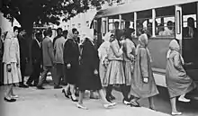 When this was met with no riots, the government decided it was time for the very controversial step of unveiling.[32] In 1959, women employed by the state, such as radio announcers, were asked to come to their work places without the veil, instead wearing a llose coat, scarf and cloves; aafter that, the foreign wives and daughters of foreign born wives were asked to venture out on the streats in the same way, and in this way, women without the veil were started to be seen in the streats of Kabul.[33] In August 1959, on the second day of the festival of Jeshyn, Queen Humaira Begum and Princess Bilqis appeared in the royal box at the military parade unveiled, alongside the Prime Minister's wife, Zamina Begum.[32] A group of Islamic clerics sent a letter of protest to the Prime minister to protest and demand that the words of sharia be respected.[32] The Prime minister answered by inviting them to the capital and present proof to him that the holy scripture indeed demanded the chadri.[32] When the clerics could not find such a passage, the Prime Minister declared that the female members of the Royal Family would no longer wear veils because the Islamic law did not demand it.[32] While the chadri was never banned, the example of the Queen and the Prime Minister's wife was followed by the wives and daughters of government officials as well as by other urban women of the upper class and middle class, with Kubra Noorzai and Masuma Esmati-Wardak known as the first commoner pioneers.[32]