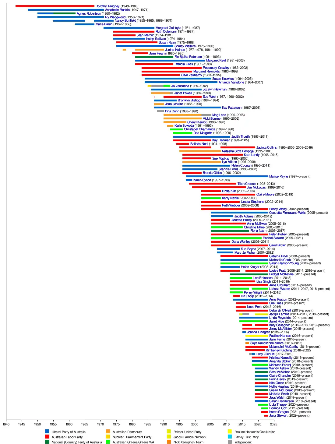 | 3 | Agnes Robertson | Liberal / Country | WA | 22 February 1950 – 30 June 1962 | retired |