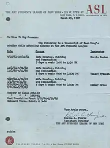 The Art Students League, which Wong Keen enrolled in from 1961-1966, played a significant part in educating a new generation of artists working with recourse to abstract expressionism.[5][22] Wong enrolled in the Life Drawing, Painting and Composition course instructed by faculty members Morris Kantor, Vaclav Vytlacil, and Sidney Gross over the period 1961-1965. The course required Wong to dedicate 3.5 hours a day, 5 days a week.[9][5] Wong earlier years in New York were marked by a degree of poverty, requiring him to take up part-time jobs on top of selling his paintings.[23] Following the award of the League's Ford Foundation tuition scholarship in 1964, which covered the cost of one course of his choice, he was able to concentrate more on his practice.[4]