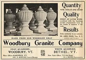 As the building granite market declined, the WGC shifted to monuments and mausoleums.[7]: 242 This put it in direct competition with well-established monumental granite centers, such as Barre. While the WGC had opened its Woodbury "Blue" quarry in 1911, and promoted that stone as "Imperial Blue Granite for high-class polished monuments" and "The blue that never fades", it did not succeed. In 1924, however, the company reopened the Blue Quarry and instituted an aggressive promotional campaign through retailers. The company produced catalogs and brochures to help sell gravestones and monuments and instituted the "Memorock" brand for memorials, monuments and mausoleums.[28][29]: 1 Other granite cutters boasted that they used Woodbury stone,[30]: 48 and the company was big enough that two of its products, Woodbury Gray and Bethel White, were used as comparisons in advertisements for other granite companies.[31]: 18 However, the WGC struggled in competition with the established monument granite companies.[6] The company was reorganized in 1927; W.C. Clifford was its president. The next year, however, F.L. Hardy became the company's president, and corporate headquarters were moved to Bennington.[6]