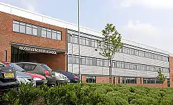 The original building, completed in 1962, was partially destroyed in a large fire in 1973.[4] It caused many pupils to be transferred to other schools while the building was demolished and replaced with a newer building. Some pupils were housed in a temporary structure made out of portable units that was reinforced by a brick built super structure at the back of the school grounds - this was built to be a temporary home for the upper school while the new main building was built and was intended to be pulled down once the new part of the school opened, with a maximum life of around 3 years. It was finally demolished in 2005 as part of the extension work, 30 years after it was first built. On the site of this building, called the Westfield Building, is a new large car park.[4]