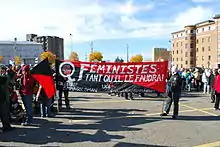 The Marche mondiale des Femmes or World March of Women is an international feminist movement that advocates for gender equality and aims to take action against discrimination against women and reduce violence towards them.[1]