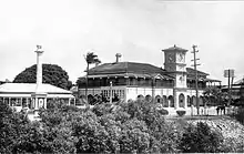 These efforts came to fruition with the construction of Jubilee Park during 1935–36, one of several projects carried out in Mackay by depression relief labour.[28] It was built on the southern half of the block opposite the drill shed and was named to commemorate the Silver Jubilee of the reign of King George V. Jubilee celebrations were held in the park on 24 May 1935, when it was officially named by the Mayor, Mr G Moody, and a Jubilee tree was planted by his wife (this tree, a type of kauri pine, no longer exists).[29] The band rotunda was officially opened later in the year on 22 December, again by Mayor Moody, who congratulated the city engineer and workmen for the design, solidity and finish of the structure.[30][1]