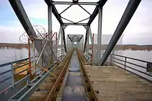 In 1984 (according to another source in 1976[2]) on each side of the line new sidings were built branching off to the Oder dike. This was intended to support a technology developed by pioneers for building a parallel pontoon bridge for the railway in the event of possible damage to the bridge. The system was tested once in 1984 and was no longer operational in 1986.[6]