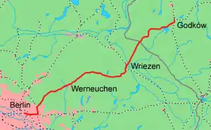 The Wriezen Railway is a line in the northeast of the German states of Berlin and Brandenburg. It runs from Berlin to Werneuchen and formerly extended via Wriezen to Jädickendorf (now Godków in Poland). Its terminus in Berlin from 1903 to 1949 was the Wriezener Bahnhof (Wriezen line station). The predominantly single-track line has operated only between Berlin-Lichtenberg station and Werneuchen since December 2006.