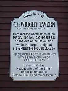 Wright's Tavern was built in 1747 by Ephraim Jones, who operated it until 1751. At the dawn of the American Revolution in April 1775, it was managed by Amos Wright, whose name it has borne ever since. On April 19, the day of the Battle of Lexington and Concord, when the courthouse bell announced the approach of Major Pitcairn's British troops, the Concord Minutemen assembled at Wright's Tavern. Later, after Pitcairn's arrival in the Concord square, British officers refreshed themselves in the tavern.[3]