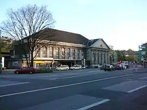 Construction of the current, only partly preserved, station building at Winklerstraße started in October 1911 and it was opened for the public on 10 October 1913.[6] The plans of the building were drafted by the Prussian architect Rüdell Alexander, who worked in a leading position in the railway department of the Prussian Ministry of Public Works.[7] The construction was directed by the government architect, Johannes Ziertmann and Edward Behne of the railway division (German: Eisenbahndirektion) of Elberfeld. The building was badly damaged in the Second World War.