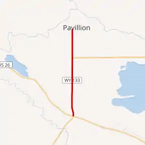 Wyoming Highway 133 begins at US 26 and the northern terminus of Wyoming Highway 132 (Blue Sky Highway) in Kinnear. Highway 133 proceeds due north toward Pavillion. At almost 4.1 miles, the western terminus of Wyoming Highway 134 is intersected which heads east towards Shoshoni. Past Highway 134, Pavillion is reached where the highway has its northern terminus at 6.07 miles.[1][2]