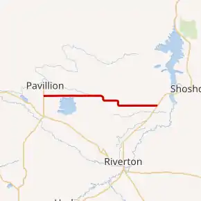 Wyoming Highway 134 begins at Wyoming Highway 133 (Pavillion Road) just south of Pavillion. WYO 134, named Missouri Valley Road, travels eastward through the northern part of the county, passing north of Ocean Lake and the Ocean Lake Wildlife Habitat Management Area[2] At just over 24 miles, Highway 134 reaches its eastern end at US Route 26/Wyoming Highway 789 southwest of Shoshoni and the Boysen Reservoir.[3]